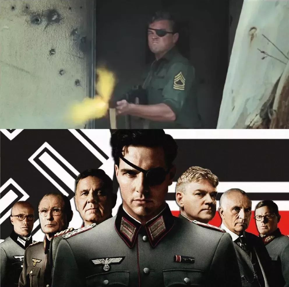 这就不得不说到阿汤哥主演的一部二战题材电影《行动目标希特勒》。可以看到,小李子的独眼龙造型跟阿汤哥几乎一模一样: