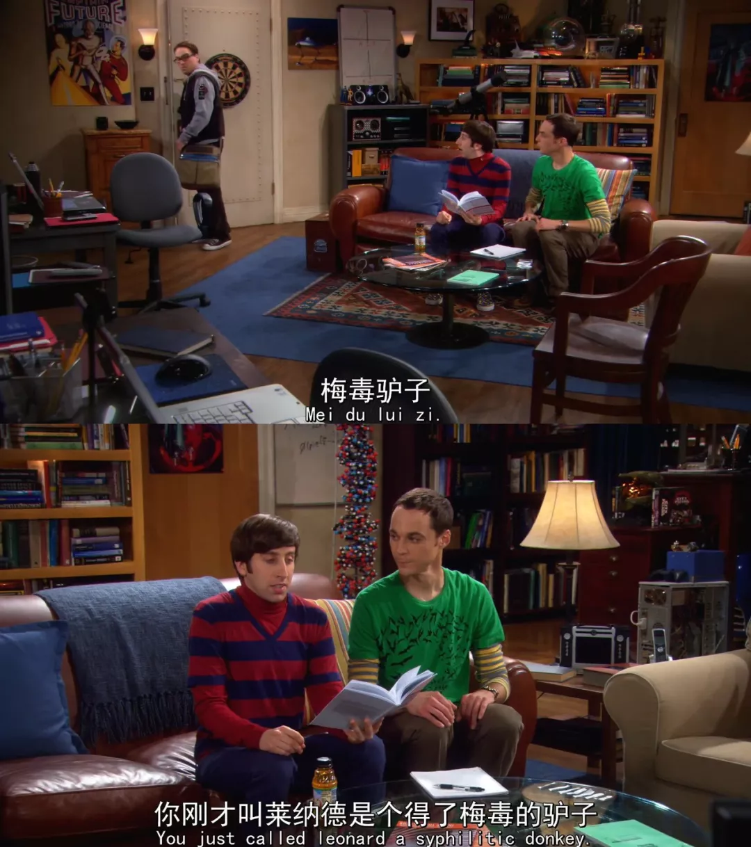 还有霍华德教谢耳朵学中文,结果教出来了那一句经典的「梅毒驴子」。