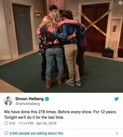 霍华德的演员Simon Helberg也发了Ins,同样是几位主演拥抱在一起的照片,还配上催泪的文字: