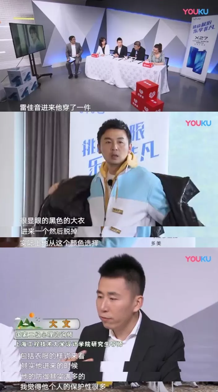 一位砖家说,雷佳音穿了件黑色大衣,从这个颜色选择上来看,他的防御性蛮多的。